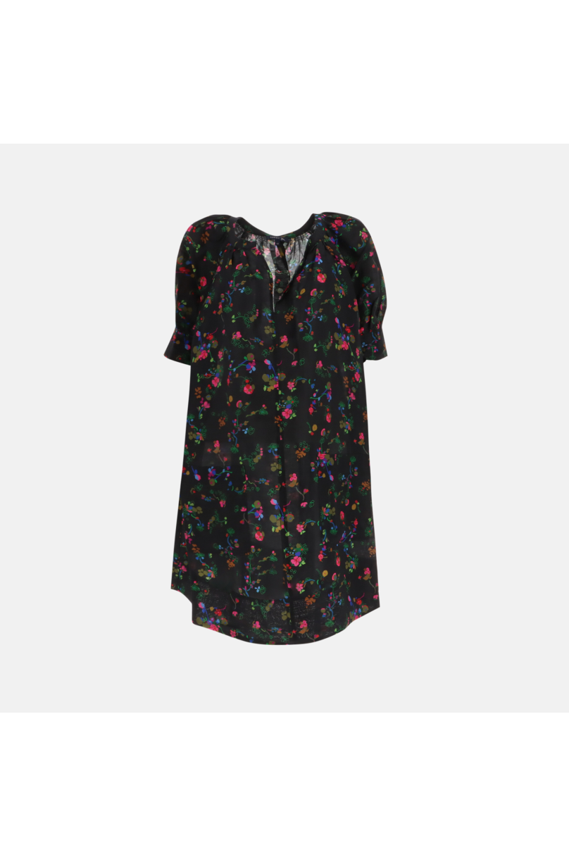 Dieses mehrfarbig bedruckte Kleid aus Seide und Leinen ist kurz und trapezförmig, hat einen runden, vorne geschlitzten Halsausschnitt, gepuffte Raglanärmel und breite Manschetten. Die aufgesetzten Taschen auf der Vorderseite verleihen dem ohnehin schon schicken Modell einen Hauch von Persönlichkeit und machen es perfekt für jeden besonderen Anlass. Ob Sie sich für einen Abend in der Stadt kleiden oder sich einfach den ganzen Tag lang schön und bequem fühlen möchten, dieses Kleid ist wie für Sie gemacht!