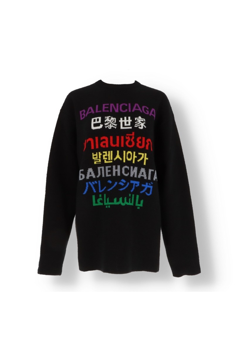 Pullover aus Wolljacquard mit dem Druck Balenciaga in mehreren Sprachen und Farben auf der Vorderseite. Rundhalsausschnitt und gerippte Details an den Ärmeln und der Taille.