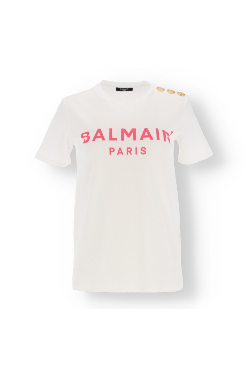 T-Shirt aus Baumwolle mit Balmain Druck auf der Vorderseite und Details aus drei Knöpfen an der Schulter.