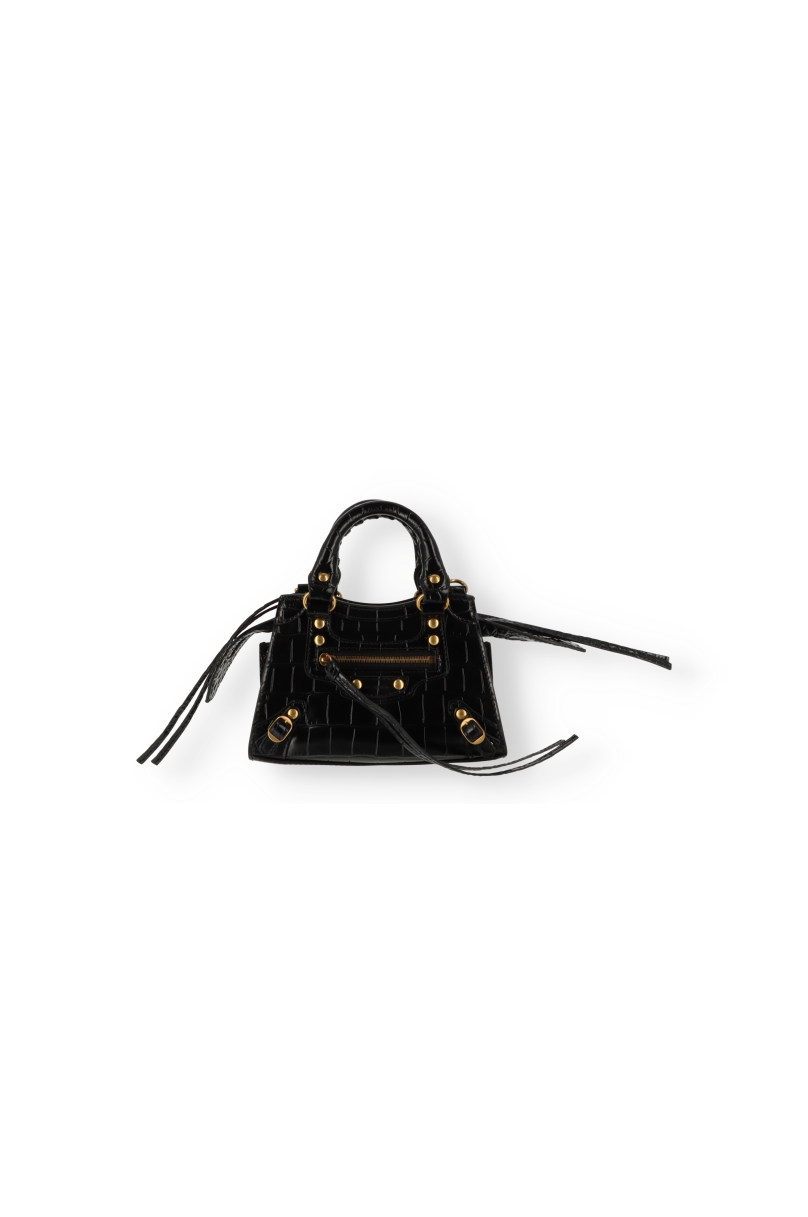Crocodile-embossed patent calfskin bag with a structured trapezoidal design. Hand-woven leather handles. Detachable and adjustable leather shoulder strap with a length of 40.9 cm. Logo embossed on the front. Zipped closure with two knotted leather pulls. Zipped pocket on the front with a knotted leather pull. Contains a patch pocket inside.