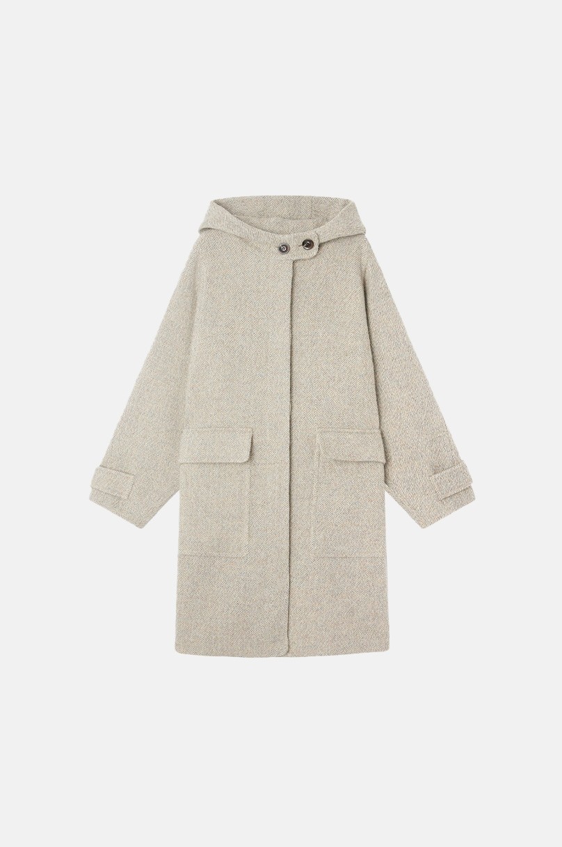 This long, straight-cut coat features a hooded collar for style and practicality. The buttoned opening, accompanied by a placket, ensures a perfect fit. With its two large double-entry pockets, it offers both functionality and elegance. A slit at the back adds a modern touch, while the light gray herringbone wool lends warmth and sophistication. An essential for facing the seasons in style!